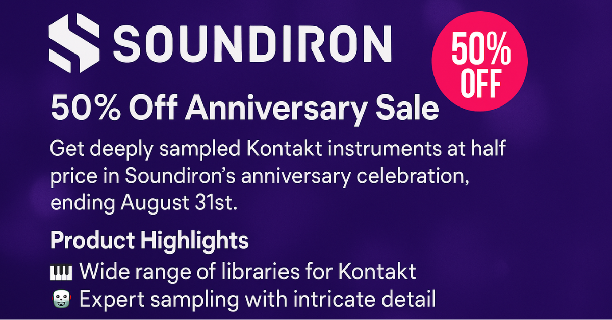 Soundiron is marking another year of innovation with an Anniversary Sale—their entire collection of Kontakt libraries is 50% off. From choirs and pianos to experimental sound design tools, this is your chance to expand your instrument library at half the price. Aug 18 – Aug 31, 2025. 👉 Grab the Deal HERE